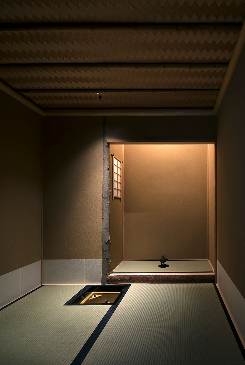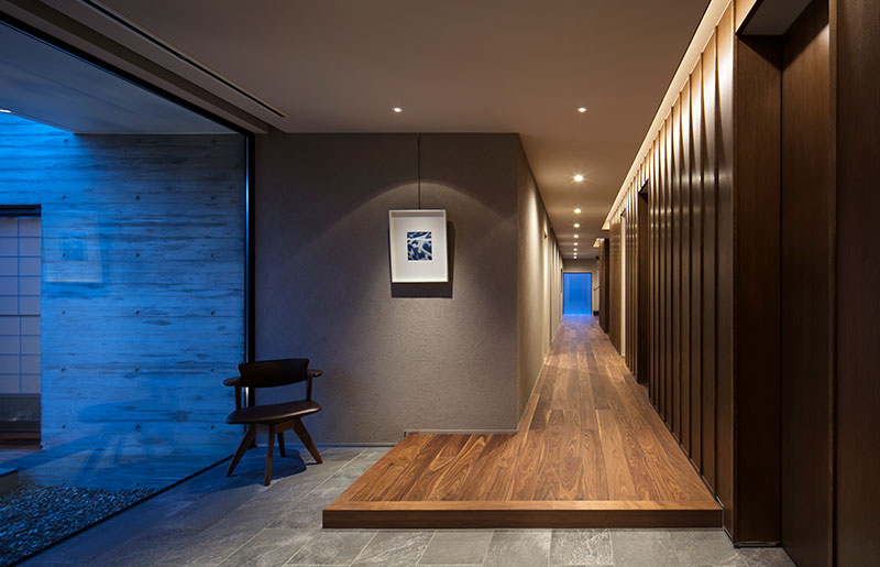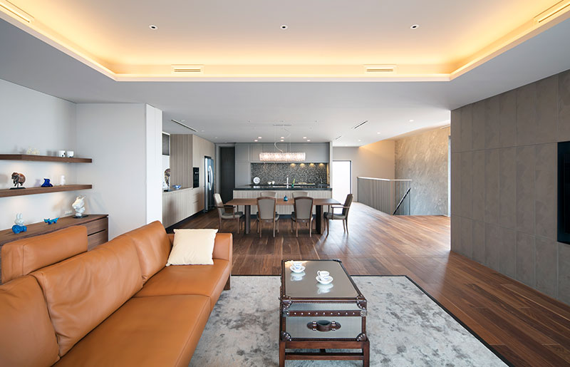 プライバシーを高めた個室に対し、開放的なリビングルーム。海外からのゲストも想定したおもてなしの茶室や眺望を楽しむテラスは、日々の暮らしだけでなくそれ以上に豊かな暮らしを得ることができる。大きな住宅では長くなりがちな動線に対し、コンパクトな移動を可能とするようにエレベーターを中央に配置。一方で住宅のヴォリュームを感じられるように玄関から20mの長い廊下を設けている。廊下が単調な移動になることを避け、空間の期待感を高めることができるように、その先の階段ホールは2階からの光が降り注ぐ、広がりのあるスペースとした。