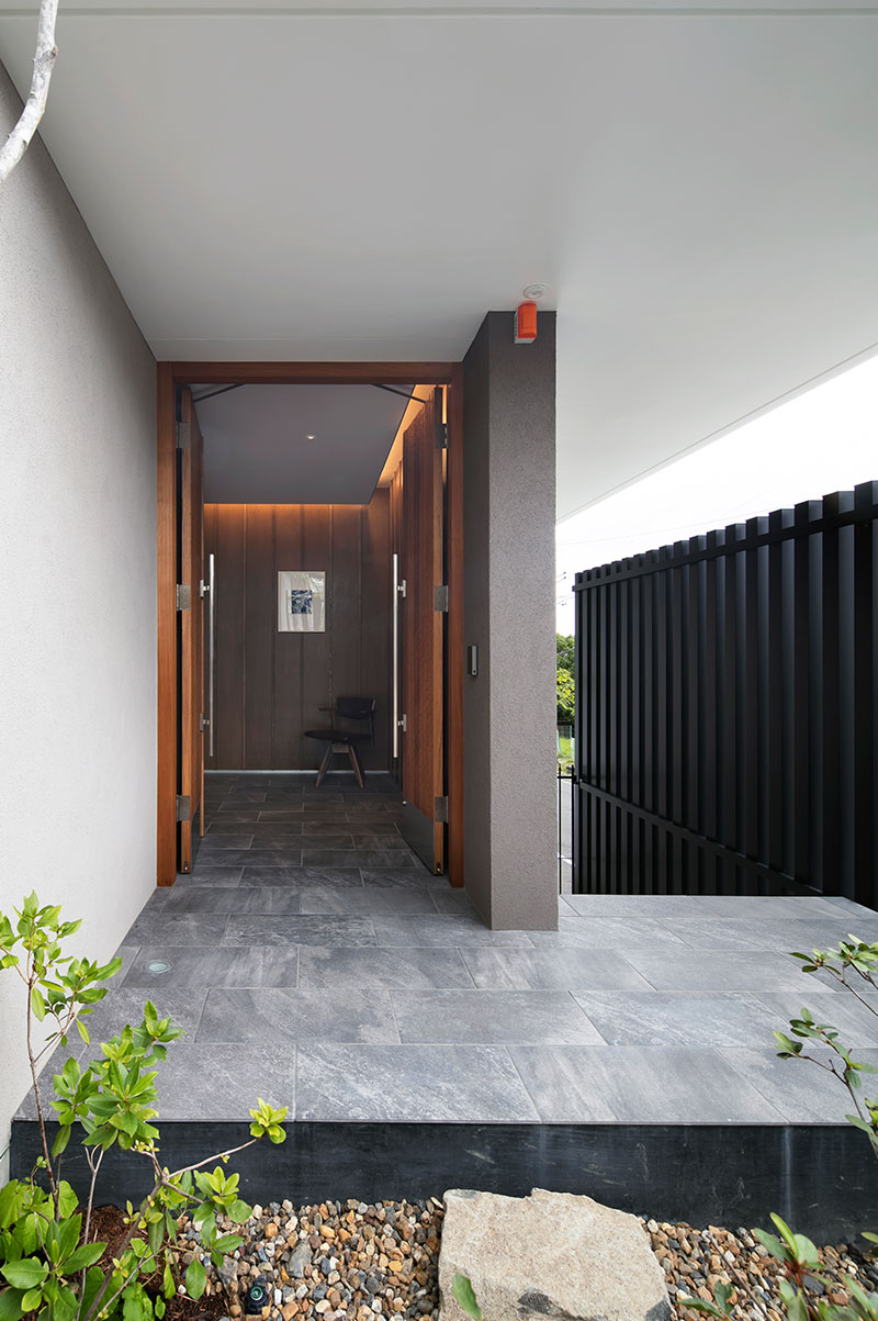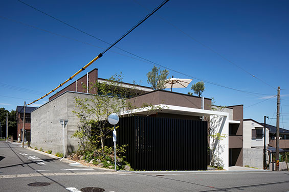住宅のヴォリュームに圧迫感を受けないよう、庭や格子による視線の抜けなど余白の領域をつくり、壁の構成に奥行きと陰影をつけている。さらに、敷地角の空地は車や通行する人々の視界を遮らないよう配慮すると共に、植栽を設けることで人々へ季節感や安心感を与えている。