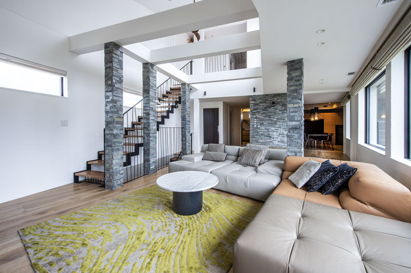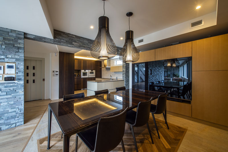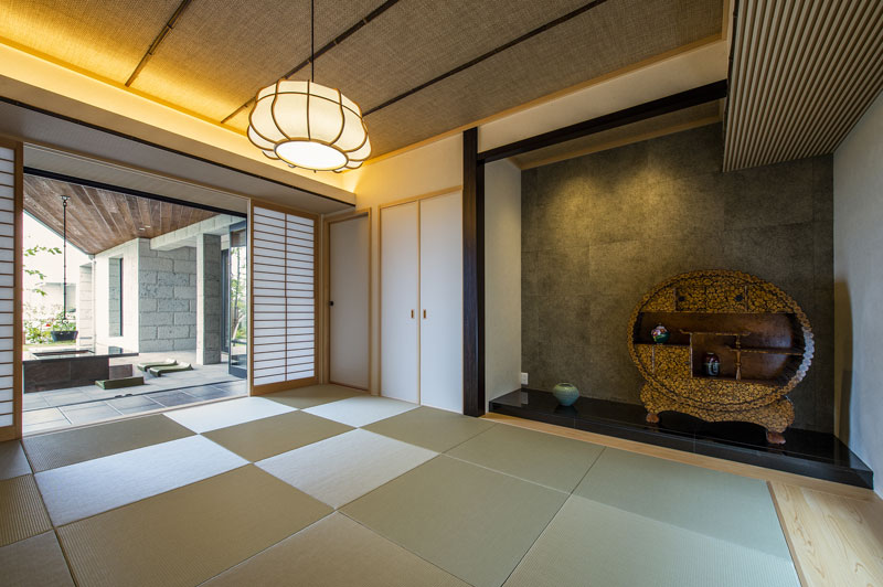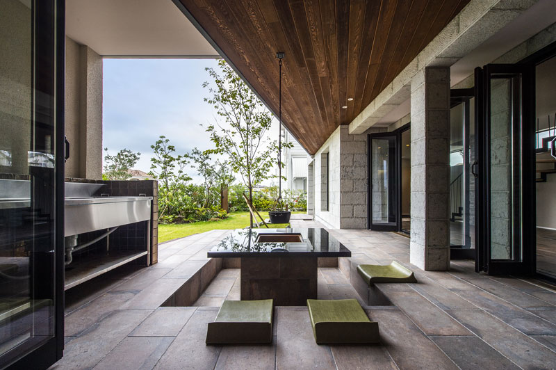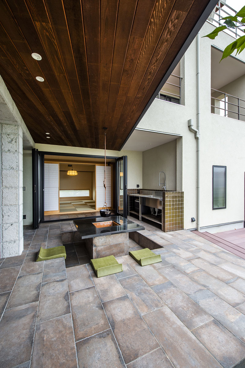 また仕事柄海外に行く機会も多くデザインには是非とも『和』のニュアンスを散りばめて欲しいというオーダーのもとに、掘り炬燵の屋外囲炉裏は縁側を挟んで和室へとつながる構成とした。エントランスホールとも大きな開口で繋げることで人の集まる場所の中心と捉えた。