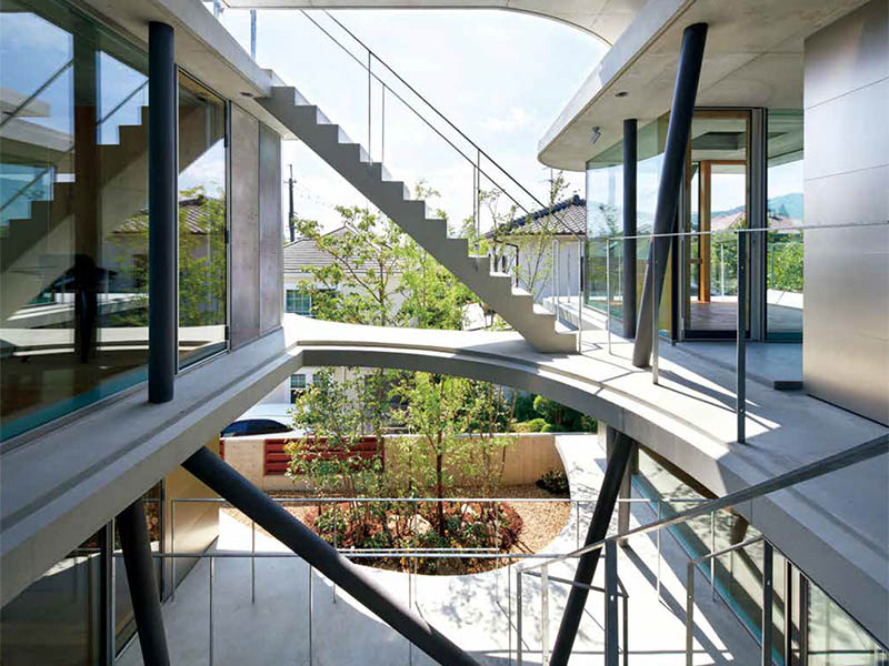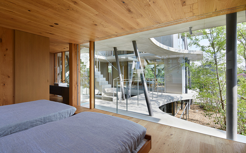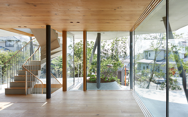 従来の壁、柱から解放された各層は、通りの並木や庭の樹木の成長を想定した気積を避けてカーブし、風や光を受け渡すような形態が現れた地形として積層されていく。