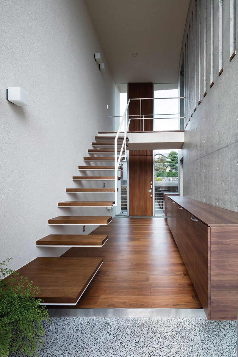 来訪者はプライベートエリアを守る円弧状の壁に沿って奥へ導かれ、高さ5mの扉を介して正面間近に雄大な富士山を望む玄関空間に入る。玄関ホールには表・裏の玄関を設けることで母屋へと通じる動線を確保し、その関係性を確立させた。