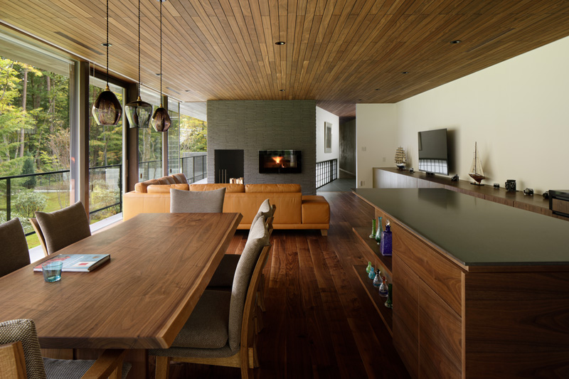 暖炉(ビルトインストーブ)を囲んで話すもよし、ダイニングテーブルやキッチン前のカウンターなど思い思いの場所で過ごしていただいているようです。