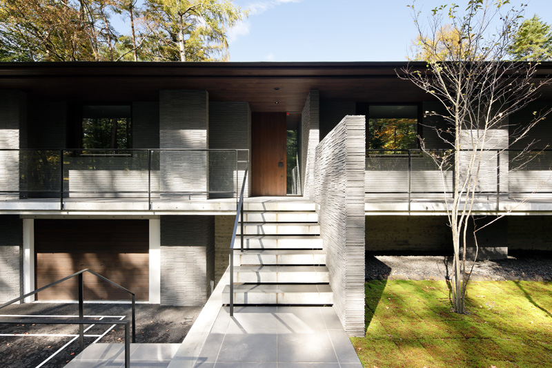 道路からガレージ、庭の高さ関係も絶妙で、これを活かした計画としています。居住スペースを地面から浮かせることで、半地下となる部分にガレージを用意しつつ、フロアレベルを地盤面からスムースに離すような空間的なしかけを生み出しています。これは旧軽井沢エリアでの湿気対策にもとても効果的です。道路と反対側の隣地は借景となるような森が残っており、道路側アプローチから敷地奥の隣地まで視線を切らずに見通せる配置計画によって、敷地の奥行を一層感じさせるものにしています。また、庭づくりは既存の樹木を活かしながら、目線に近い高さの中低木を植栽していき、緑が目に映り込んでくる軽井沢らしい自然な雰囲気をつくっています。