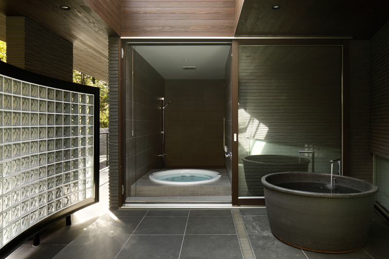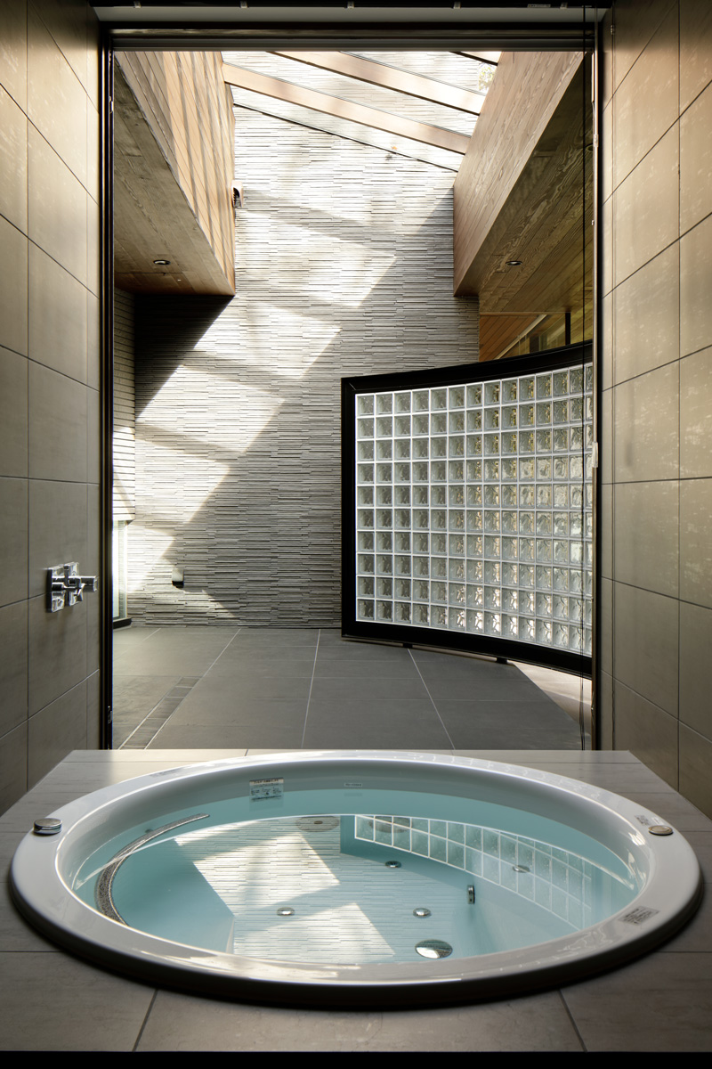 もうひとつのテラス、バスコートもHさんの家の特徴のひとつ。ガラス戸を開放すれば半露天風呂となります。ここには外風呂もあり、露天風呂を楽しむだけでなく、お孫さんのためのプールとして使ってもよし、世代を超えて楽しめる空間を用意しています。