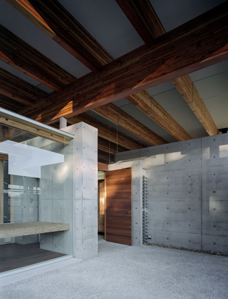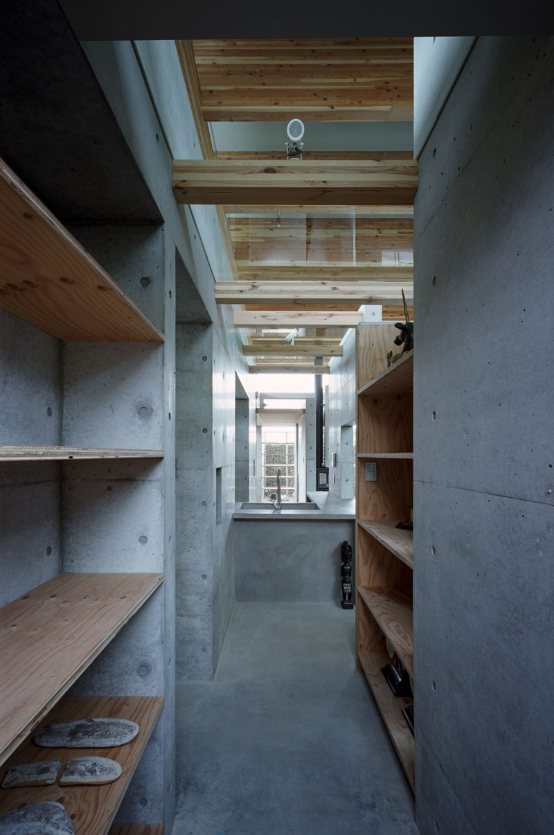 そこで、この住宅では各要素を構成するコンクリートや、鉄、ステンレス、木、合板、ガラス、石といった素材そのものを仕上げとして用いています。これにより、空間の抽象性と素材の具象性が互いを引き立たせ、静かでありながら情感豊かな空間となっています。