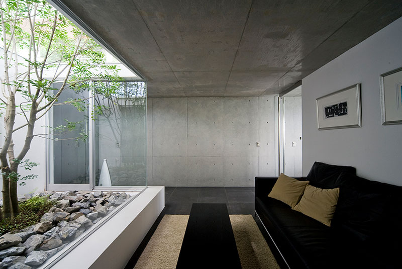建物は、鉄筋コンクリートと鉄骨造の2階建。1階をコンクリートの閉じた箱とし、寝室とサニタリー、スモールリビングによって構成。箱の上部~2階部分には、リビングおよびダイニングキッチン・書斎スペースを配置している。2階スペースは、これといった間仕切りは設けていない。あえて言うなら吹き抜けの中庭、ガラス越しのシンボルツリーがその役割を担っている。壁面には360度、水平窓を設けた。「窓」というより「ガラスの壁」という発想である。建物を取り囲む景観は全てが魅力的であり、どの側面に対しても閉じる理由が見つからなかった。