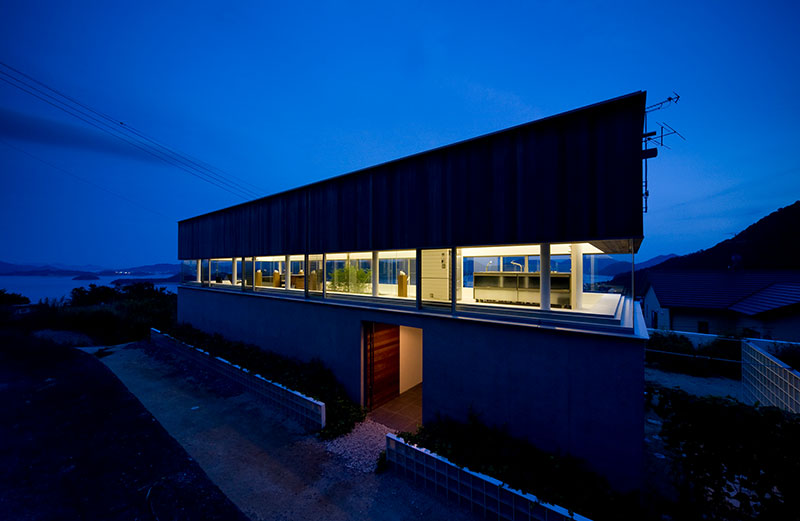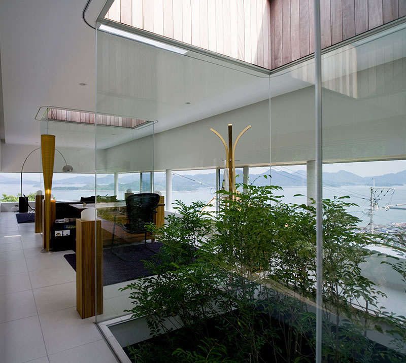 瀬戸内海が眼下に広がる山腹。南東の尾道水道から南西に目を向ければ、瀬戸田をはじめ大小の島々を遠くまで臨むことができる。北西側には瀬戸内海国立公園に指定されている筆影山を背負い、森の空気が清々しい。この場所では鳥のさえずりや木の葉のそよぎが耳に心地よい。坂道を登りこの敷地に到達すると、目の前にひらける風景に思わず息をのむ。敷地はかなりの高台にあり、この建物の2階から視界を遮るものは何もない。我々は、この場所にふさわしい家を建てようと考えた。美しい景観を最大限に享受できる家である。