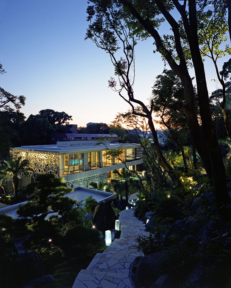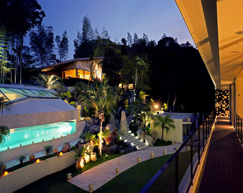 緑に囲まれた敷地内には高低差が10m程あります。その高低差を利用して、敷地の一番高い場所に、離れと露天風呂を配置して近隣の森全体を眺める眺望を確保し、斜面中腹には屋内プールを埋込んで側面を水槽のようにアクリルで仕上げ、使用していない時も山肌に水を感じられるようにし、下方に駐車場を埋込み、屋根は庭から上がれるようになっています。その斜面に対峙する形で敷地の低い位置に母屋を配置し、その母屋から眺める斜面は点在する建築と植栽により、「立体庭園」としてこの住宅の見せ場となっています。