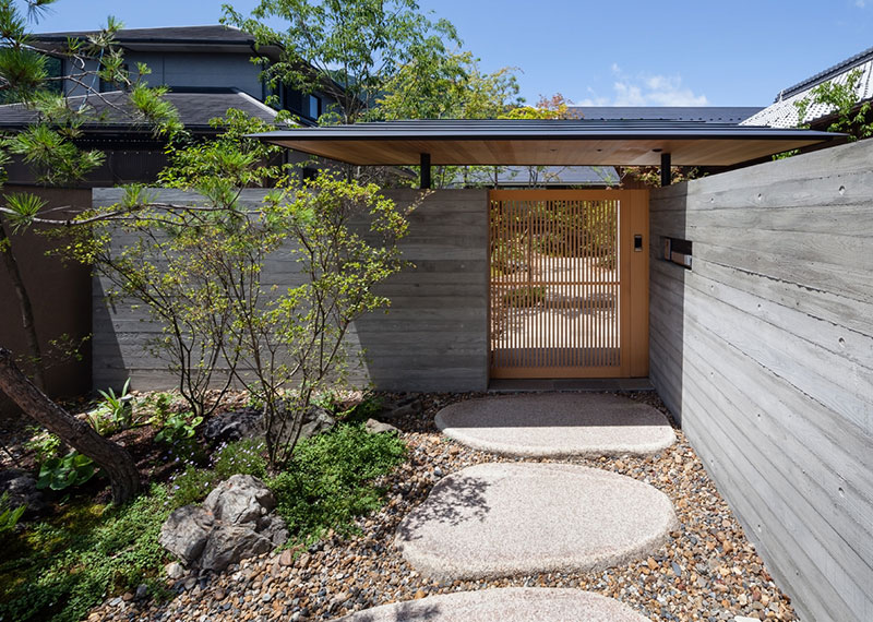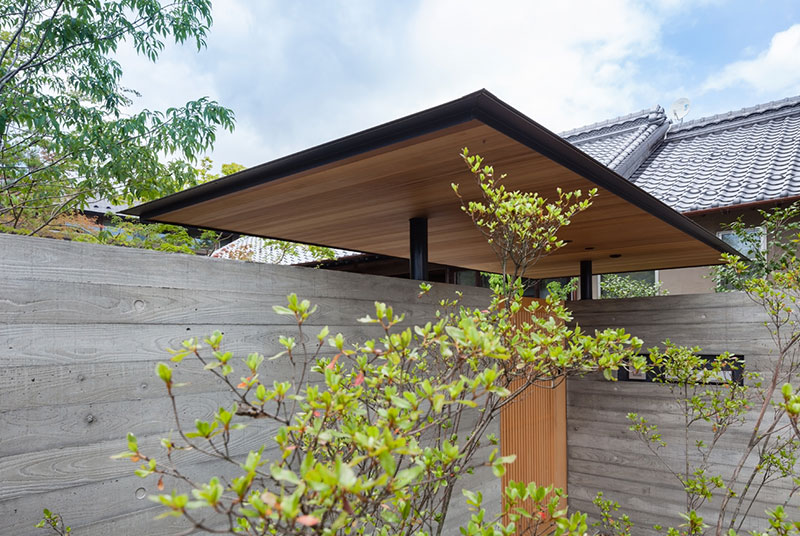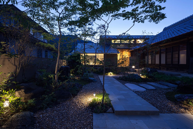 迎門をくぐり、屈曲した長いアプローチがある前庭が、新旧の建物を緩やかに融合してくれる。瓦葺で大きな切妻屋根の母屋の屋根形状を継承し、母屋と同じく4寸勾配の切妻屋根を、近代の素材であるガルバリウム鋼板横葺きで次世代へ繋ぐデザインとした。