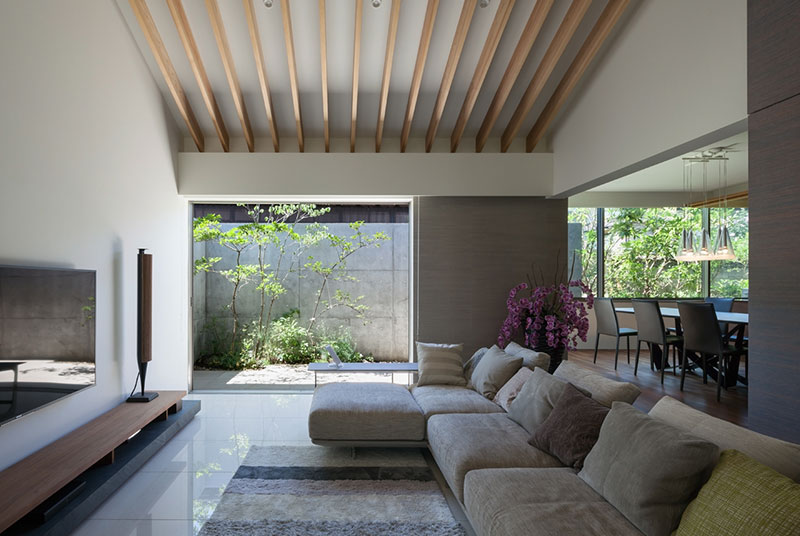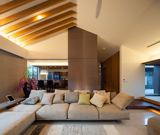 LDKは、勾配天井やさまざまな天井高、床の段差を設けることで空間に変化をもたらし、ほどよく分割し、家族にさまざまな居場所を作った。どの場所からも庭の木々が見える空間である。