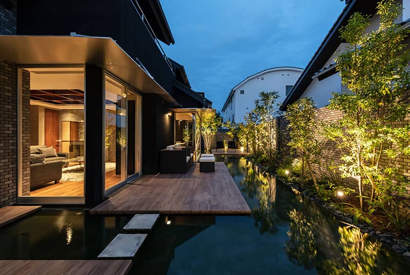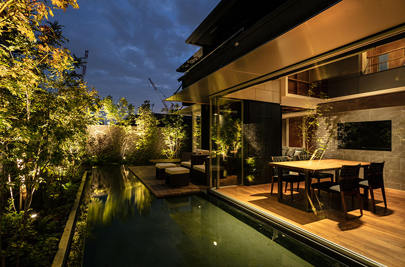 水盤の近さによる効果は大きく、日中の多くの時間帯に水面の光が間接光として室内に入り、ダイニングの吹き抜け天井を彩ります。水辺のふたつのテラスは、バーベキューができる外部ダイニングとして、夜はお酒を楽しむ外部リビングとして、くつろぐことができます。水面を眺めることで「つい時を忘れてしまう…」との言葉をいただきました。