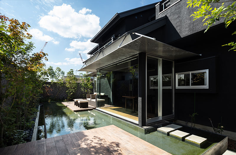 木造住宅ゆえに庭の地面と内部床のレベル差が大きく、普通に水盤をつくると、腰かけた視点から水面が見えなくなります。テラス面を1階の床レベルまで上げて、水面もそのレベル近くに設定して親水感を強めました。庇を延ばして内部からの視界を絞りこむことで、隣の建物の近接による現実感を解消しました。庇は直射日光を遮ること、軒下が広がり内外をよりスムーズに繋ぐことのためにも効いています。