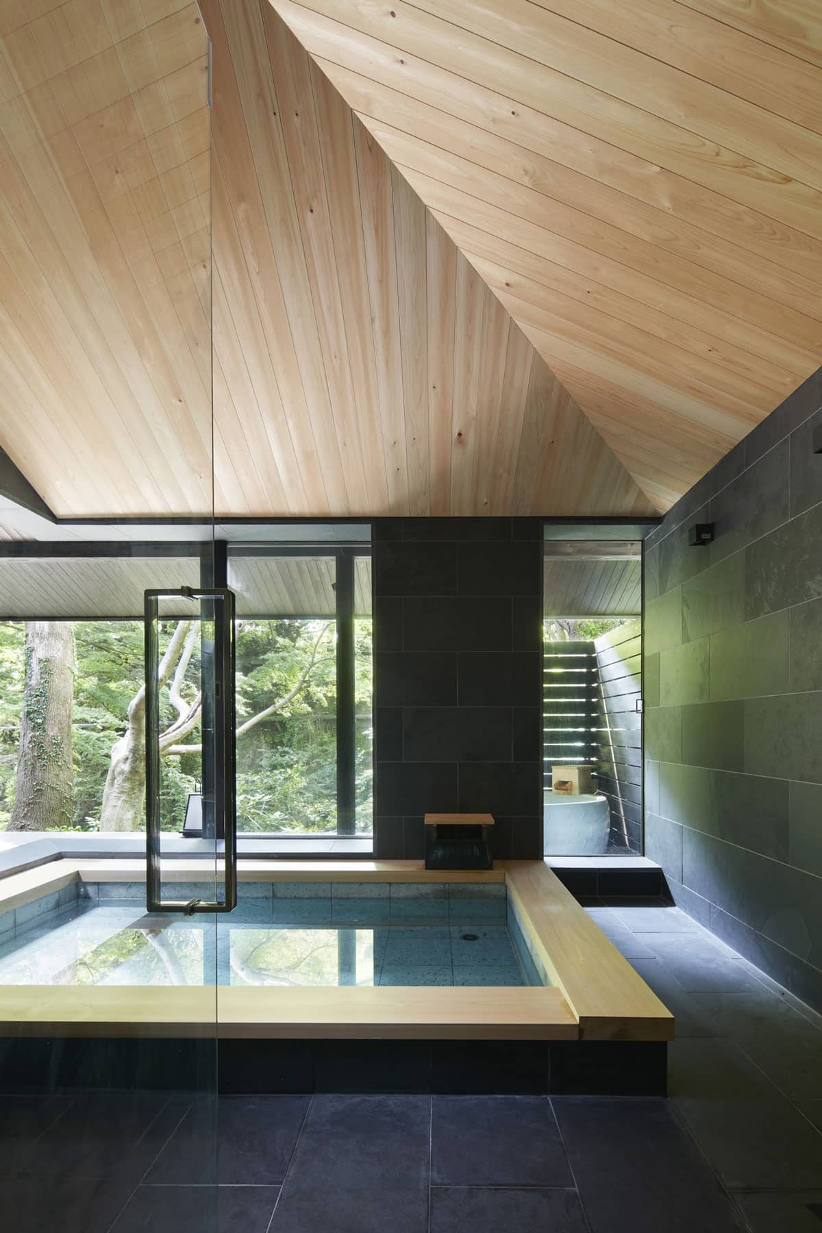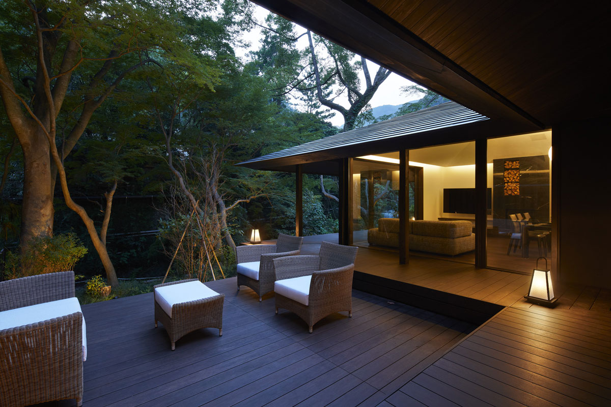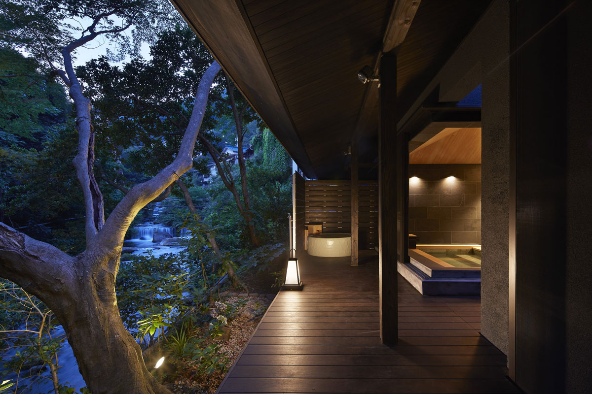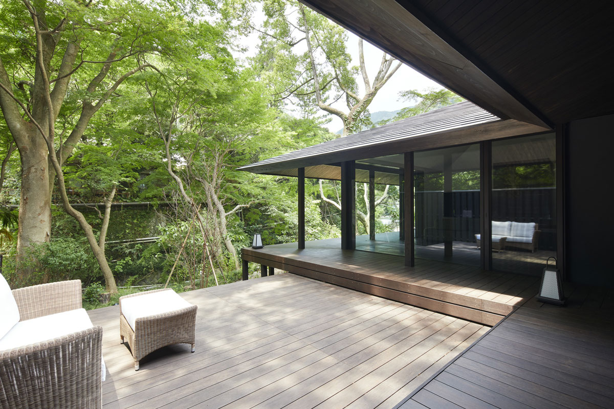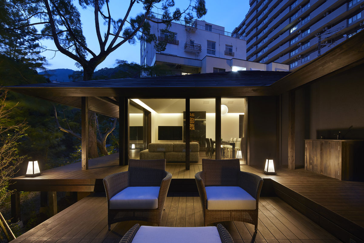 湯河原の町を流れる千歳川。その川の流れを眺めながら時間を過ごすことが出来るその建物は、大きな軒が出ています。その軒下にある壺温泉やアウトドアソファで、寛ぎながら川の流れる音を聞くことが出来る建物です。