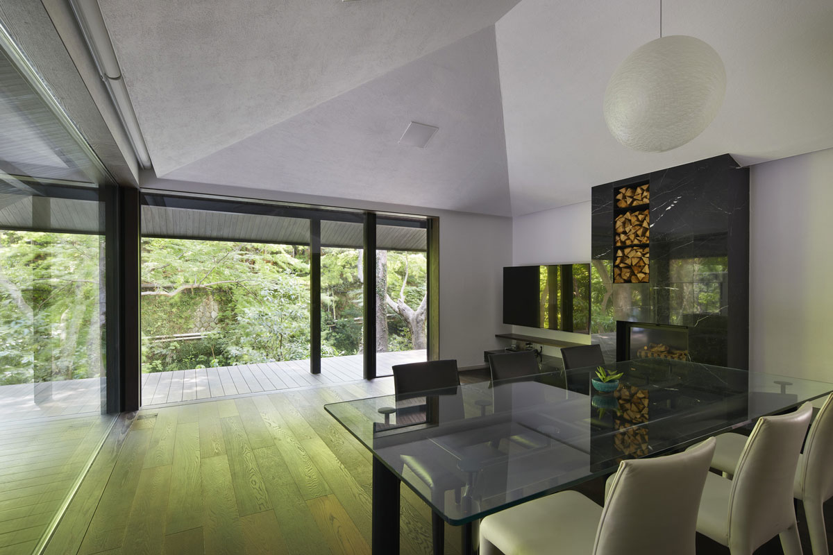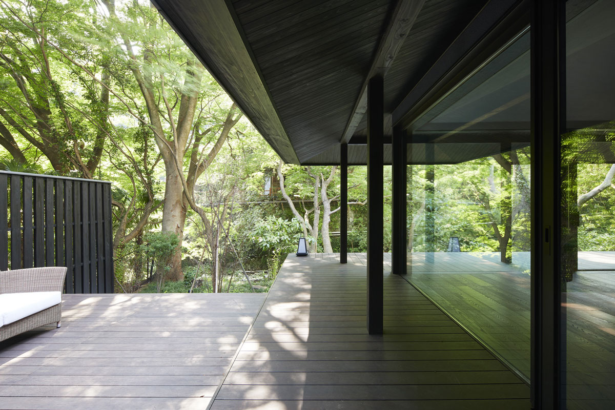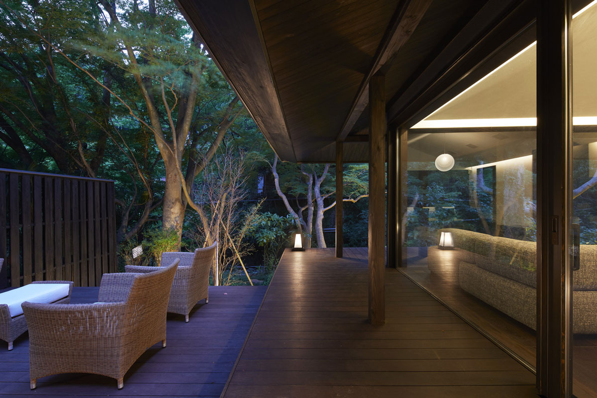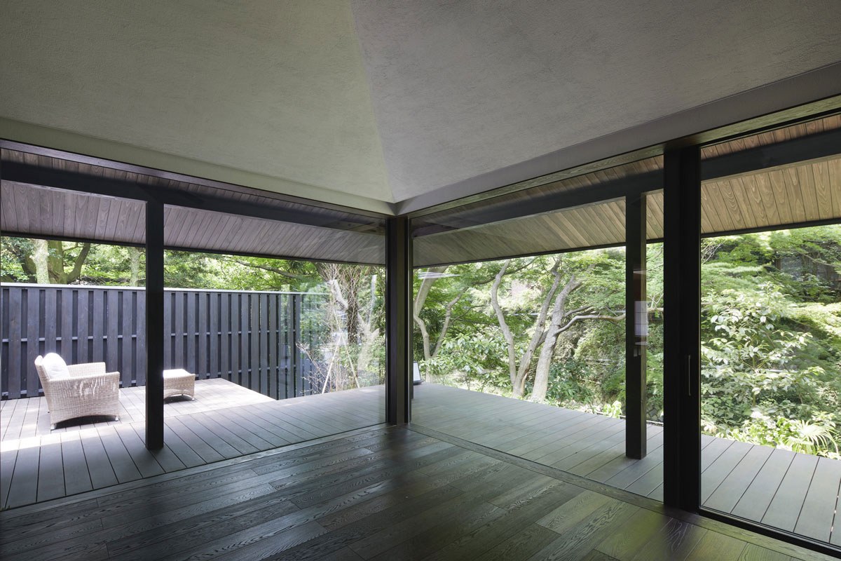 軒下の縁側とひと続きのリビングや温泉から見える風景は湯河原の町の豊かな緑と川だけです。それは雑多に点在するものがある風景の中から、素敵な景色だけを抜き出す演出を大きな軒下が一役買ってくれているからです。