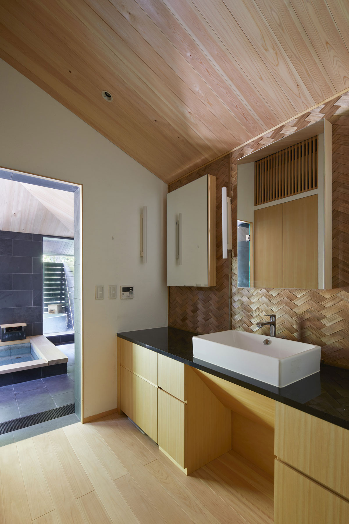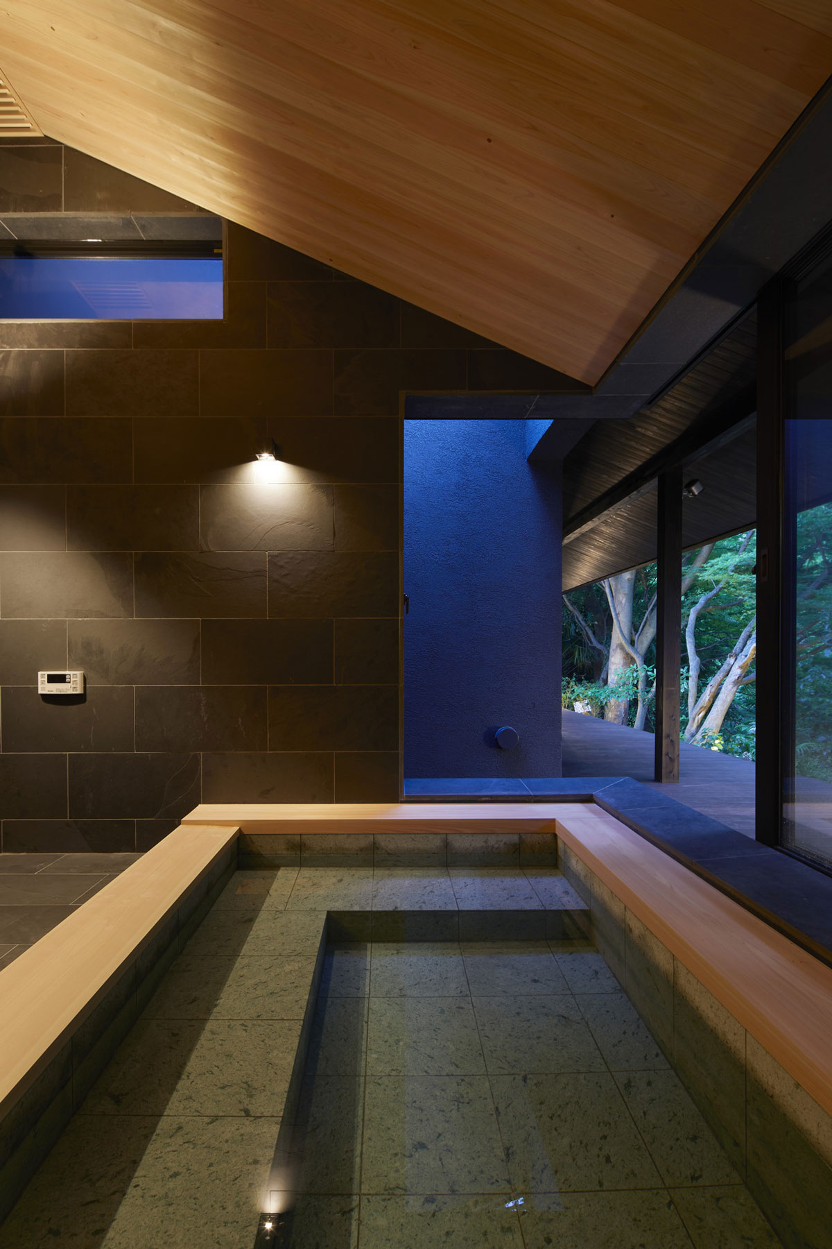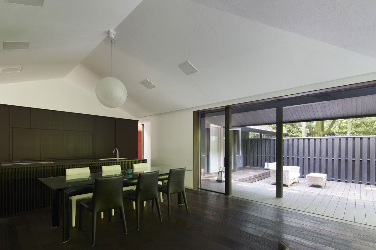 軒下の縁側とひと続きのリビングや温泉から見える風景は湯河原の町の豊かな緑と川だけです。それは雑多に点在するものがある風景の中から、素敵な景色だけを抜き出す演出を大きな軒下が一役買ってくれているからです。
